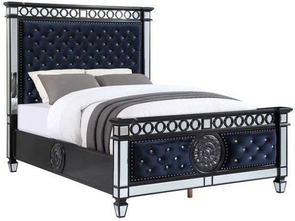 The Varian II Eastern King Panel Bed showcases a luxurious design with a padded headboard and footboard featuring crystal-like button tufted detailing in dark blue velvet with a solid pattern. This elegant bed brings a touch of sophistication and comfort to any bedroom decor.Read More