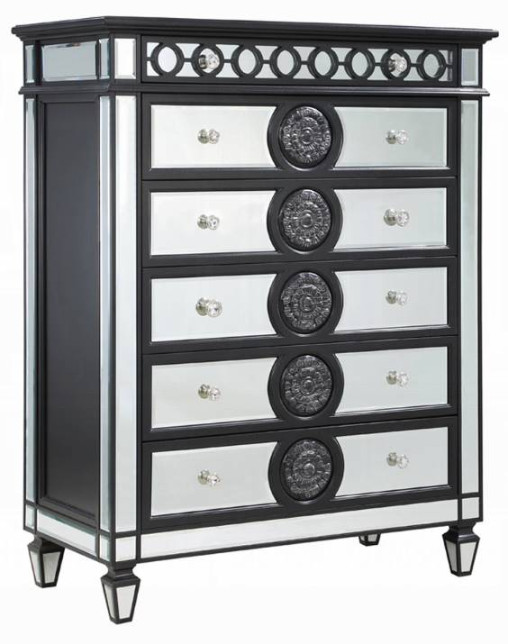 The Varian II Black/Silver Chest is a chic and practical piece for any bedroom. This chest features a sleek black frame with silver accents, adding a touch of glamor. It has six spacious drawers, including a felt-lined top drawer for delicate items.Read More