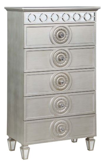 The Varian Chest exudes elegance with its silver finish. Featuring five spacious drawers and it combines stylish design with functional storage, making it a perfect addition to any sophisticated space.Read More