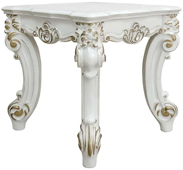 The Vendome II End Table features a square design with ornate scrolled legs. Crafted with attention to detail, this table lacks shelves or drawers, emphasizing its sophisticated antique pearl finish and timeless elegance, ideal for enhancing your living room's charm.Read More