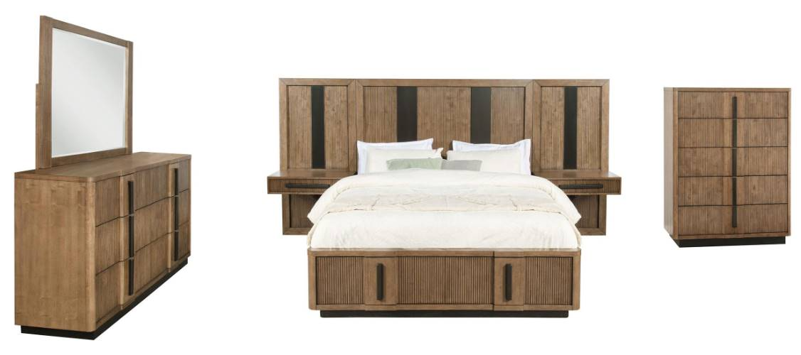 A modern six-piece queen bedroom set with wall panel bed and attached nightstands creates a handsome centerpiece and includes storage