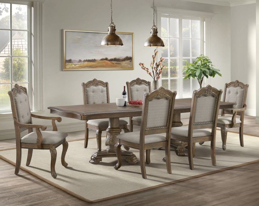 Supported by a sturdy double pedestal base, it ensures stable and elegant support. Silver nailhead trim on the chair back adds refined elegance, while carved legs and arms showcase intricate beauty. Tufted beige upholstery offers a plush, inviting feel, combining comfort with classic style that never goes out of fashion. Ideal for creating memorable dining experiences in any home.