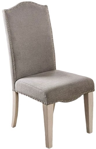The fluting up the legs of the chairs give them an added sense of height, as they eyes are naturally drawn up to the gray upholstered seating. Small touches like a nailhead trim, camel back design and sleight curving back give this set a touch of class.
