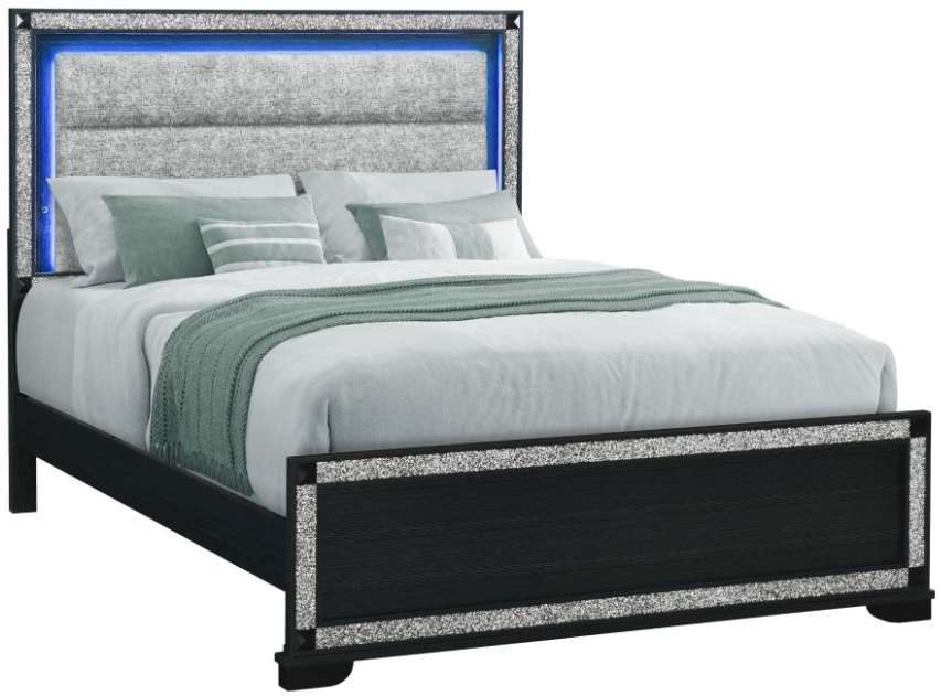 The Soleil Queen Bed blends modern sophistication with a touch of glamour. Its rich dark charcoal frame is paired with a grey upholstered headboard outlined in shimmering crushed crystal trim. The built-in LED lights add a warm, ambient glow, making it a show-stopping centerpiece for your bedroom.Read More