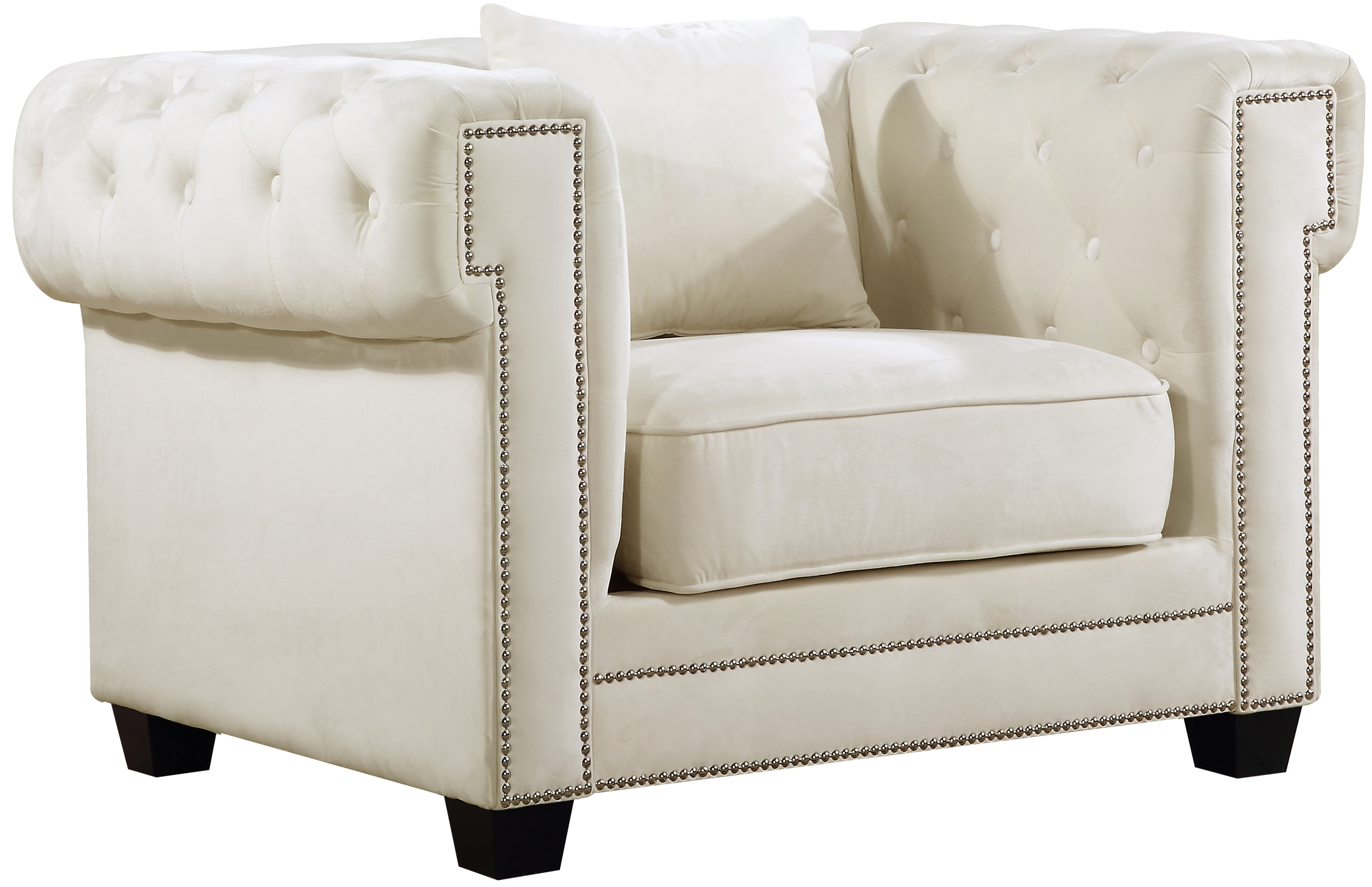 The Bowery chair showcases a contemporary silhouette wrapped in soft cream velvet upholstery. Its sleek design, plush seating, and nailhead trims create an inviting centerpiece that blends comfort with sophistication in any stylish living space.Read More