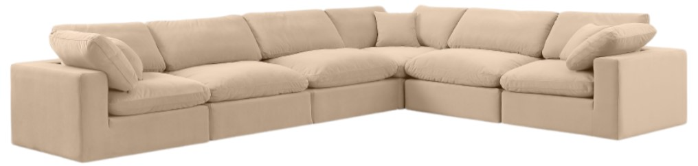 Wrapped in rich beige durable velvet upholstery, this sectional offers a plush embrace of overstuffed down feather cushions, carefully crafted to deliver the highest level of comfort. The perfect seat for creating an oasis for relaxation, this sectional has thick foam surrounding its frame for added support and coziness.
