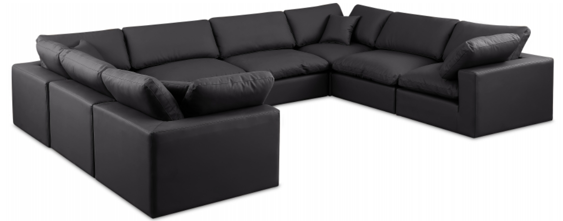 Wrapped in rich black durable vegan leathered upholstery, this sectional offers a plush embrace of overstuffed down feather cushions, carefully crafted to deliver the highest level of comfort. The perfect seat for creating an oasis for relaxation, this sectional has thick foam surrounding its frame for added support and coziness.