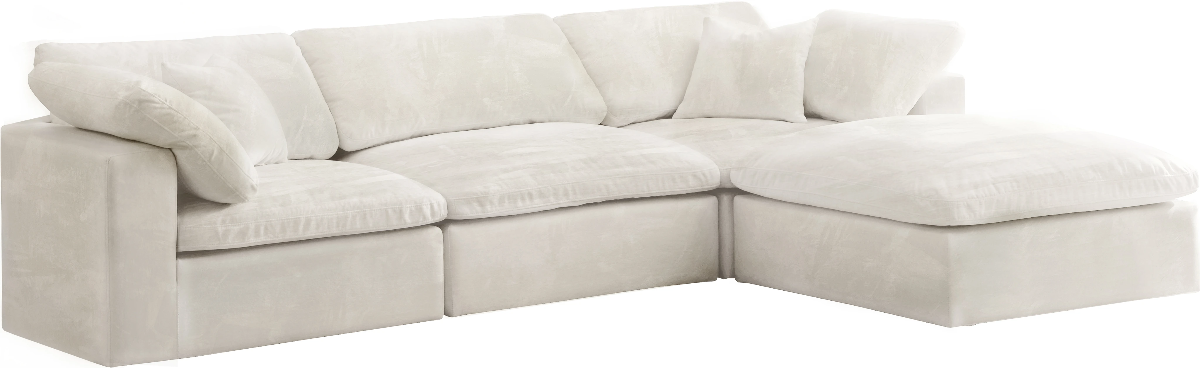 Bring home this Cozy 4-piece sectional for a fresh new look. Embrace casual elegance with this Cozy velvet cloud-like comfort modular fiber-filled seating option. Handsome from all angles, this piece features soft cream velvet upholstery to make it an easy fit in any room.Read More