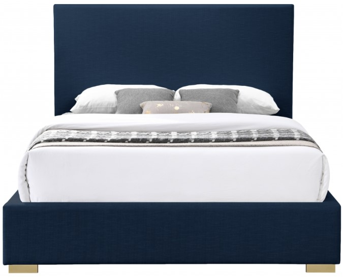 The neutral fabric rich navy linen textured upholstered from head to footpairs easily with any number of color schemes. An ideal option for any room where minimalism is the order of the day, this bed comes with both gold and chrome legs for a custom look.