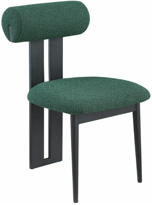 Spread contemporary beauty to your dining room space with this Dario Dining Chair. This chair features a unique back-hugging rolled pillow support that makes meals more comfortable while giving the chairs a modish aesthetic. Rich green boucle fabric on the back and seat is soft to the touch and easy to maintain, even in your busy home.Read More