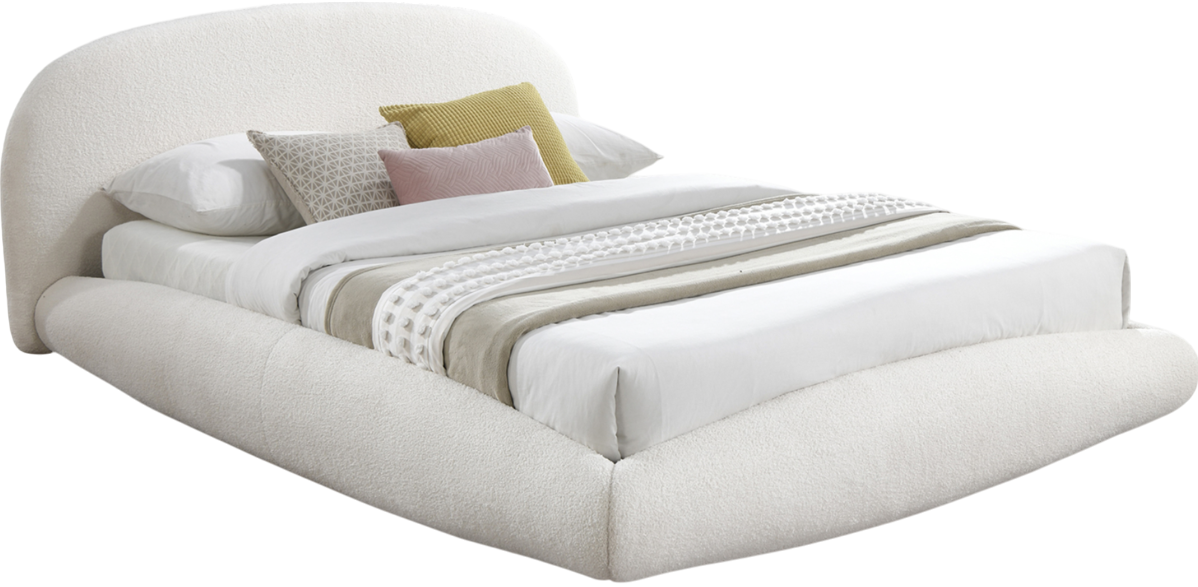 Refresh your bedroom with the Genesis cream faux shearling teddy fabric queen bed, upholstered in soft plush. The rounded headboard, rails, and footboard create the illusion of a floating bed, introducing a sleek contemporary touch to your space.Read More