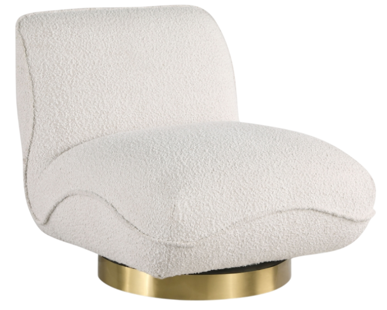 Have a seat and get cozy with this Geneva swivel chair that's upholstered in rich, cream boucle fabric. Its padded seat makes it ultra-comfortable, and its solid wood frame provides ample lumbar support.Read More