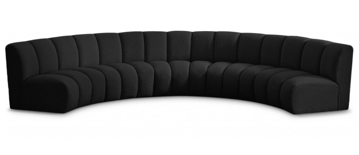 Elegant and eye-catching, the stunning black boucle fabric Infinity 5-piece Modular Sectional from Meridian Furniture is the perfect addition to any space. The deep channel tufting adds a touch of sophistication to the sectional, making it a statement piece that will elevate any decor.Read More