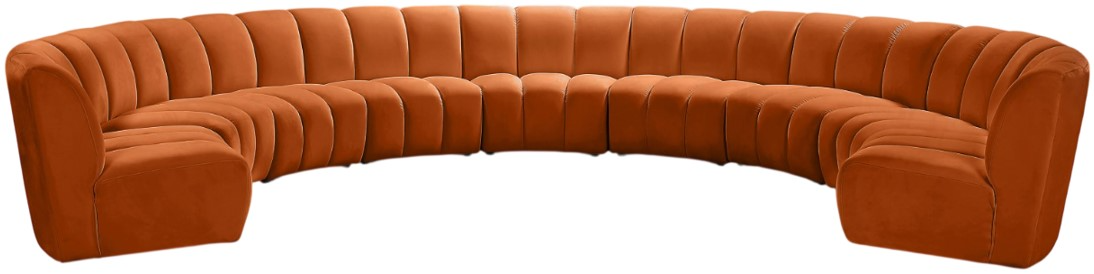 Create a seating group that works for every possible situation with this Infinity modular 9-piece sectional and other pieces in the Infinity collection. Upholstered in soft cognac velvet material that feels great against the skin and offers long-wearing beauty.Read More