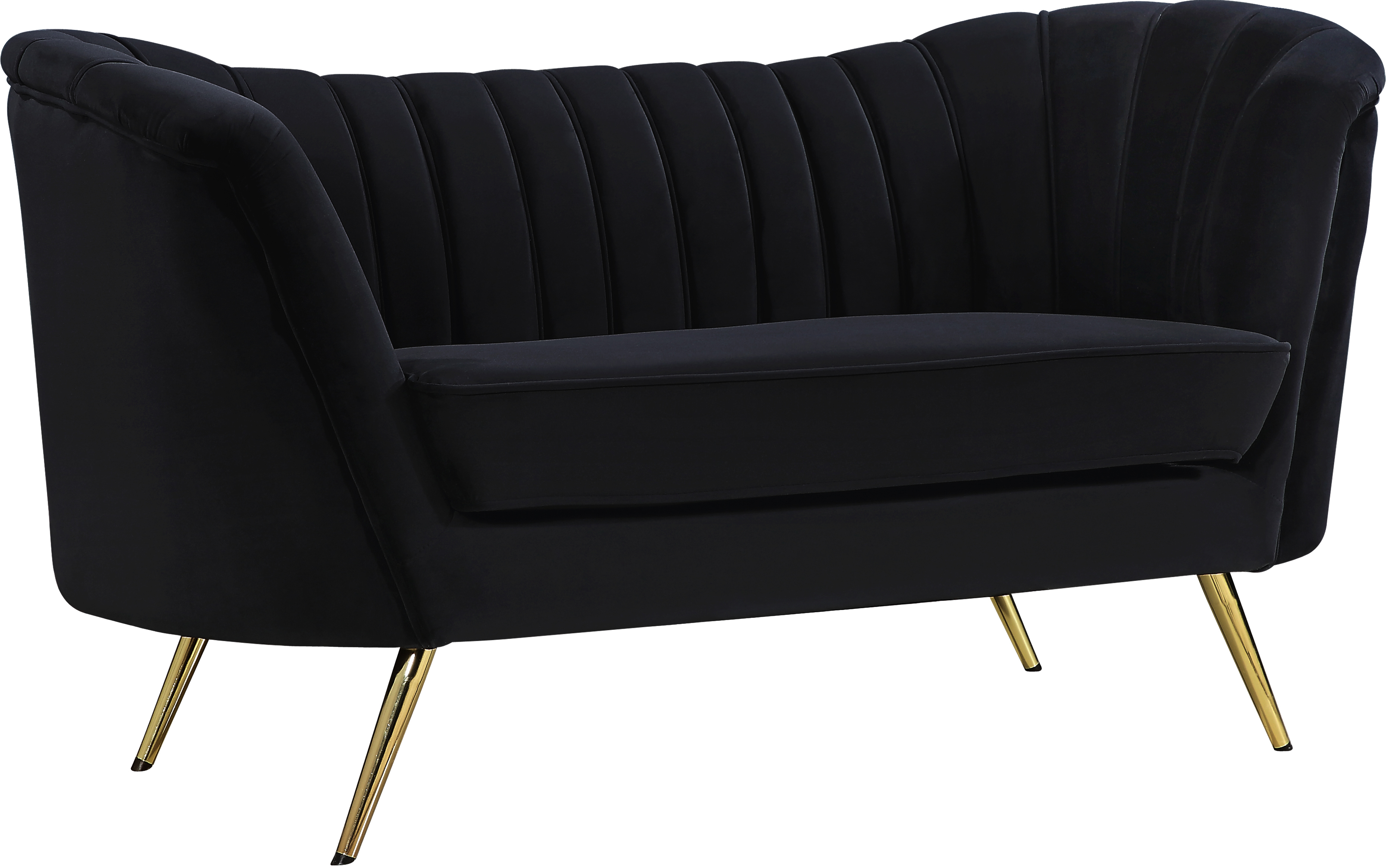 Gold stainless steel legs support this loveseat and provide stunning contrast to the loveseat's plush, black fabric.