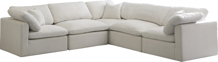 The soft cream velvet material is soft and welcoming to the touch, and the set's cushions are overstuffed with a down and feather blend to provide ample support for tired bodies.