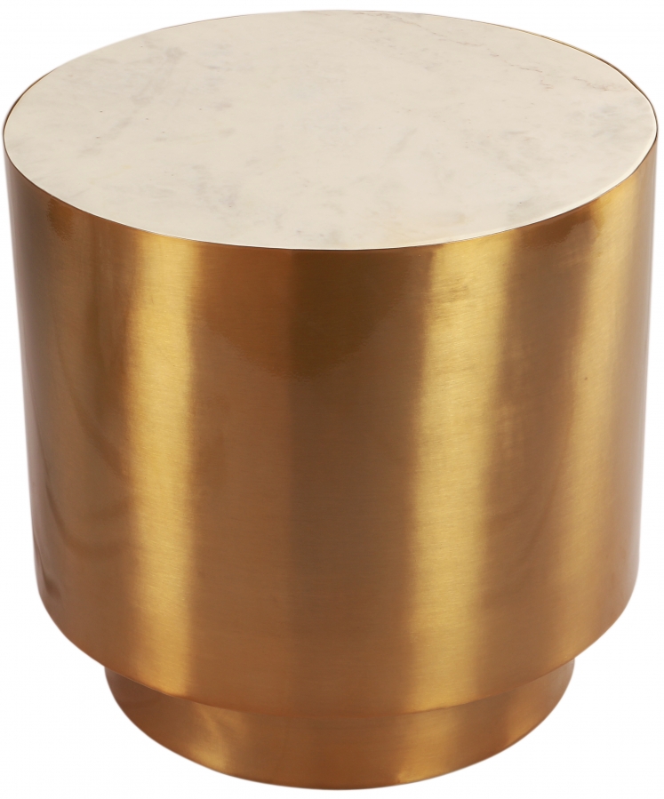 Make a bold statement in your living space with this Presley End table from Meridian Furniture. Its solid, contemporary design features a genuine marble top with a brushed gold metal base that complements each other nicely. Its round surface is perfect for holding books, knick-knacks, and other odds-and-ends items that you have laying around your living room, den, family room, bedroom, or any other space in your home that you decide to place it.