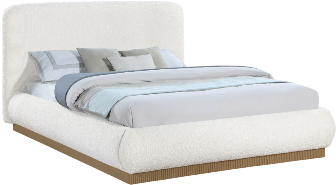 Give your bedroom (and yourself) the royal treatment with this Rigby cream boucle fabric queen bed. Wrapped in rich cream boucle fabric, its natural finish fluted base exudes sophistication. Fully slatted, it eliminates the need for a box spring, offering modern convenience.Read More