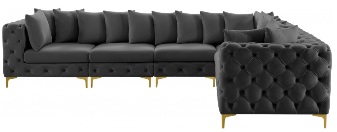 Lean back and relax on this Tremblay sectional. Featuring soft grey velvet upholstery with deep button tufting, this sectional adds a bold touch to any living space. A complete set of gold and chrome legs are included, so you can change it up to suit your home décor.Read More