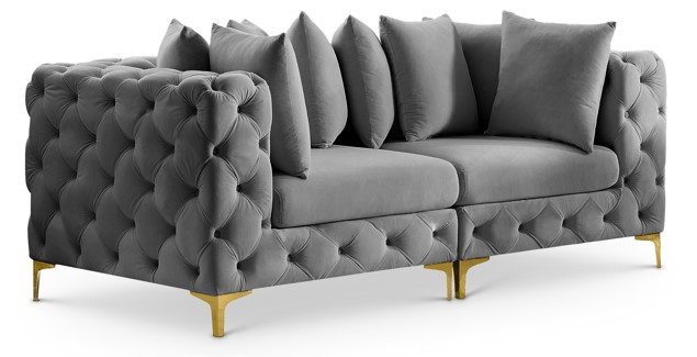 Lean back and relax on this Tremblay sofa. Featuring soft grey velvet upholstery with deep button tufting, this sofa adds a bold touch to any living space. A complete set of gold and chrome legs are included, so you can change it up to suit your home décor.Read More