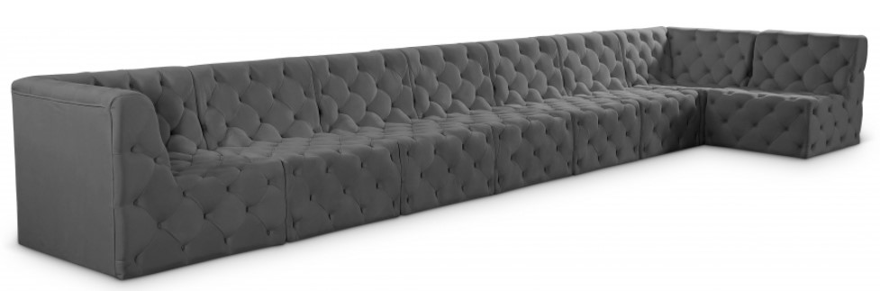 The grey velvet Tuft modular sectional from Meridian Furniture is a sofa composed of separate modules that can be arranged in different configurations to fit your living space. The sofa is upholstered in a soft grey velvet fabric and features deep button tufting, giving it a classic and elegant look.Read More