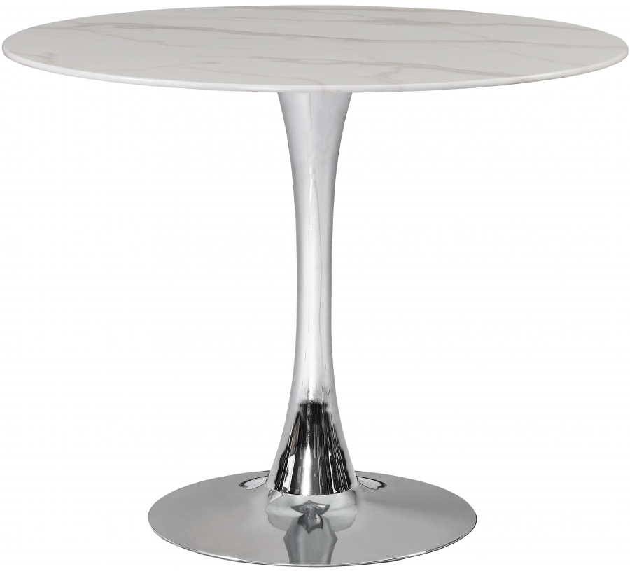 Add the Tulip 36" dining table to your kitchen, den or office to enjoy its petite size and elegant lines. The tabletop is made of 10MM thick glass with a glamorous marble veneer. A shiny silver pedestal base adds to the appeal of this gorgeous piece.Read More